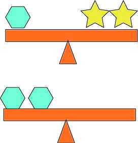 上のシーソーがつりあっているとき下のシーソーをつりあわせるには☆はいくつ必要ですか?