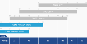 TOEFL Primary®にはStep 1・Step 2という2つのレベルのテストがあります。step1の方がファーストステップなのでこちらの試験から挑戦し最終的には留学レベルに必要なTOEFL iBT®の受験を見据えた試験内容になっています。